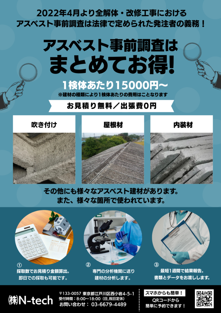 2022年4月より、解体工事におけるアスベスト(石綿)事前調査が完全に義務化されました。施主(発注者)には、適切な調査を行うための「情報の提供」と「適正な費用の負担」という法的義務があります。N-tech(エヌテック)では、見積・現調に伺う全社員が有資格者であり、調査から除去まで自社一貫体制で、江戸川区・葛飾区の地域特性に合わせた安全な工事を提供します。